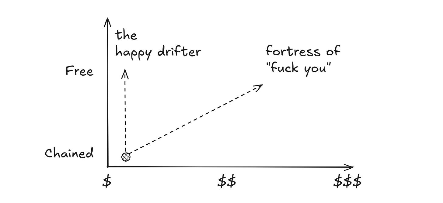 That’s what I wanted. Freedom of movement, time, and choice. Freedom to roam, to flourish, and freedom to say no. Naively, I thought that more money necessarily meant more freedom. Like so: