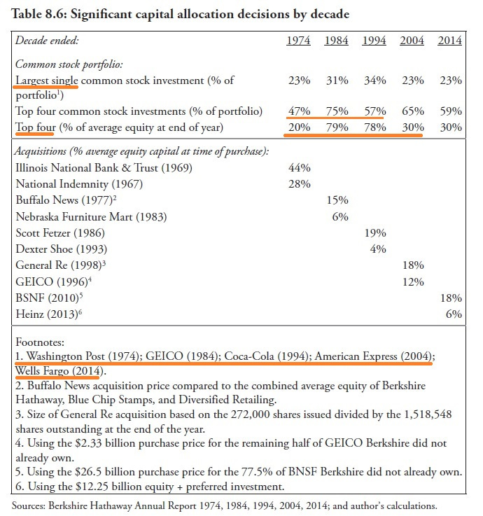 The following table hints at different themes throughout the decades. Notice the changing concentration in the top four stock positions and the growth and decline of the stock portfolio as a share of the overall equity.