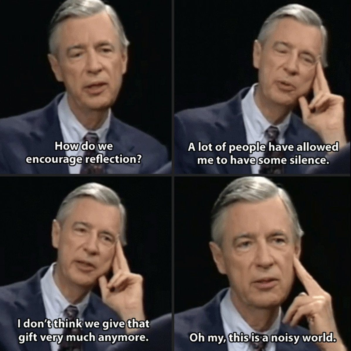 "I don't think we give the gift [of silence] much anymore. I'm very concerned that our society is much more interested in information than wonder, in noise rather than silence." - Mr. Rogers