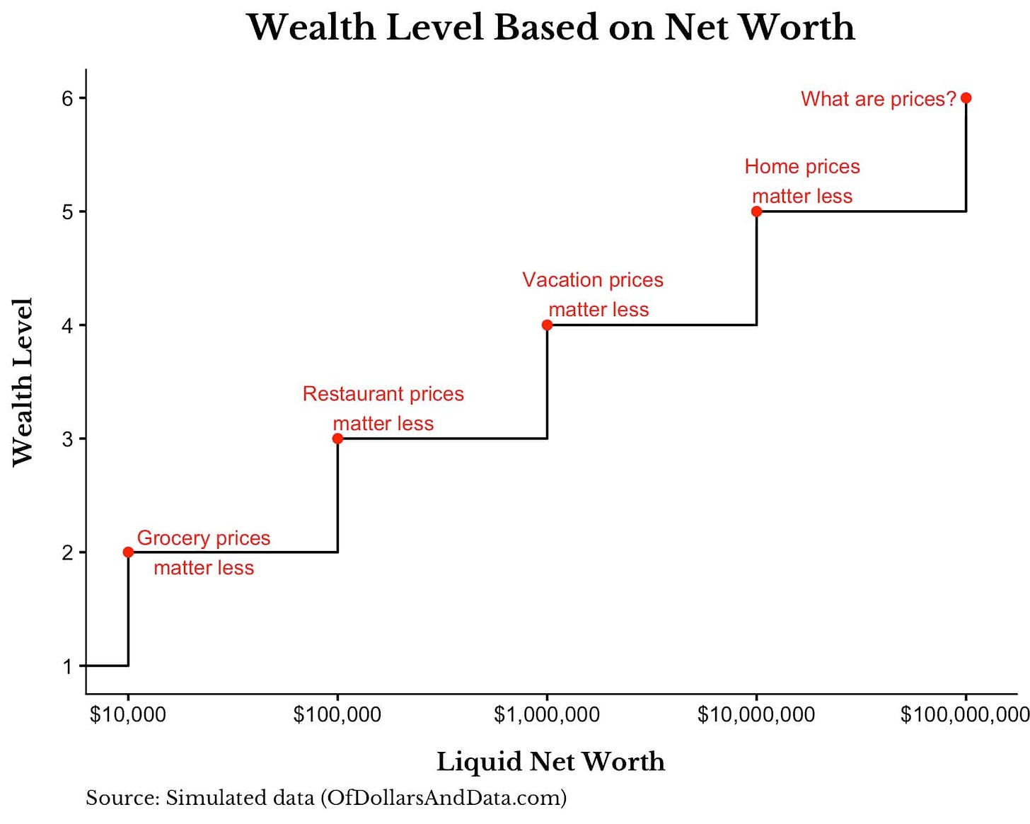 “0.01% is a good proxy for what constitutes a trivial amount of money for any level of wealth. … For each category, the marginal spending decision represents about 0.01% of the net worth level shown. … When you view wealth in this way, it looks more like steps than a smooth, ever-increasing line. This is because most people in the same level of wealth consume in much the same way … It takes a giant step in wealth to fundamentally alter how we live our lives. And the steps only get larger as we go higher up the wealth scale. So think about whether that step is worth it.”