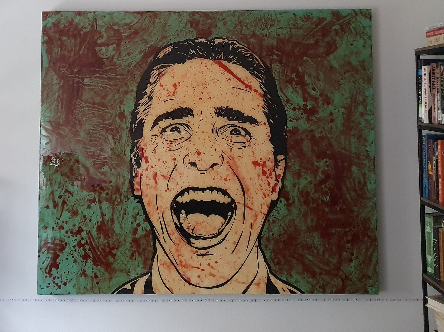 It is up on the wall now though and as they said in the Big Lebowski, “it really ties the room together.” It was made by an artist friend and is based on the movie American Psycho. Thankfully I am long past the point when I wanted to be the slick banker in an expensive suit. However, I still appreciate the book and movie’s message, and the closing monologue always stuck with me: